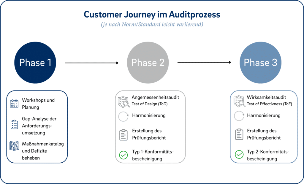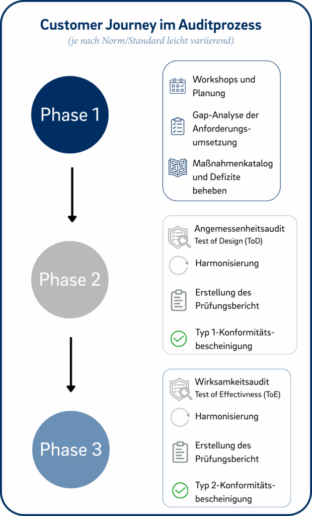 So schaffen wir gemeinsam die Voraussetzungen für eine erfolgreiche Compliance-Testierung und stärken gleichzeitig die Sicherheit sowie Zuverlässigkeit Ihrer Daten, Prozesse und IT-Systeme. Ihr Weg mit uns unterteilt sich grundsätzlich in drei Phasen.
